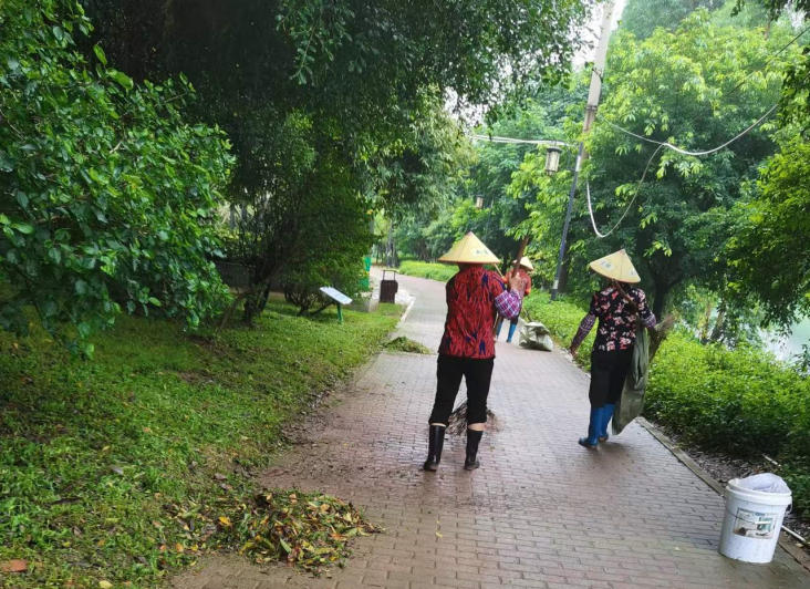 工作人员对管辖范围内的公园、绿道等地的树叶、枯枝、积水、垃圾等进行全面清理。
