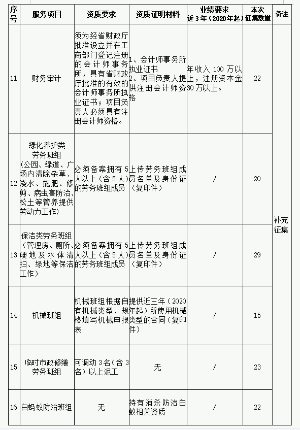 为扩大供应商资源、优化名录库管理,进一步提高招标采购工作效率及名录库利用率,提升供应商服务质量水平,现继续开展征集工作。 一、征集类型及范围 (一)2023年第一批供应商名录库征集类型数量未达30家,本批将继续征集。 (二)根据工作需要,新增类型: 服务类:活动策划/执行类、节地评价报告编制单位类、林地可研编制单位类、洪水影响评价报告编制单位类